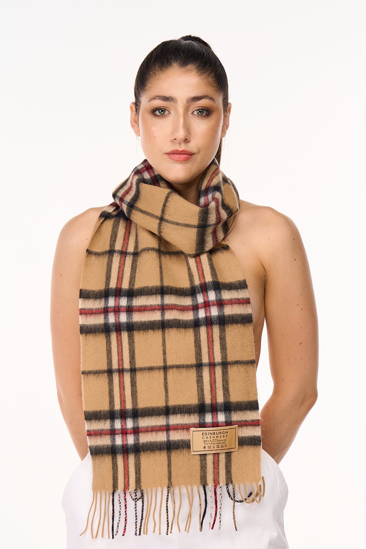 Scottish tartan scarves are iconic and recognized worldwide. Some of the most famous  tartans scarves include Thomson Camel not only to showcase Scottish heritage but also serve as fashionable and symbolic accessories. Many Scottish clans have their own tartans, and the choice of tartan often reflects a person's Scottish ancestry or personal preferences. You can find scarves in these tartans in various materials, 100% pure Extra fine cashmere, making them popular choices for both warmth and style worldwide.