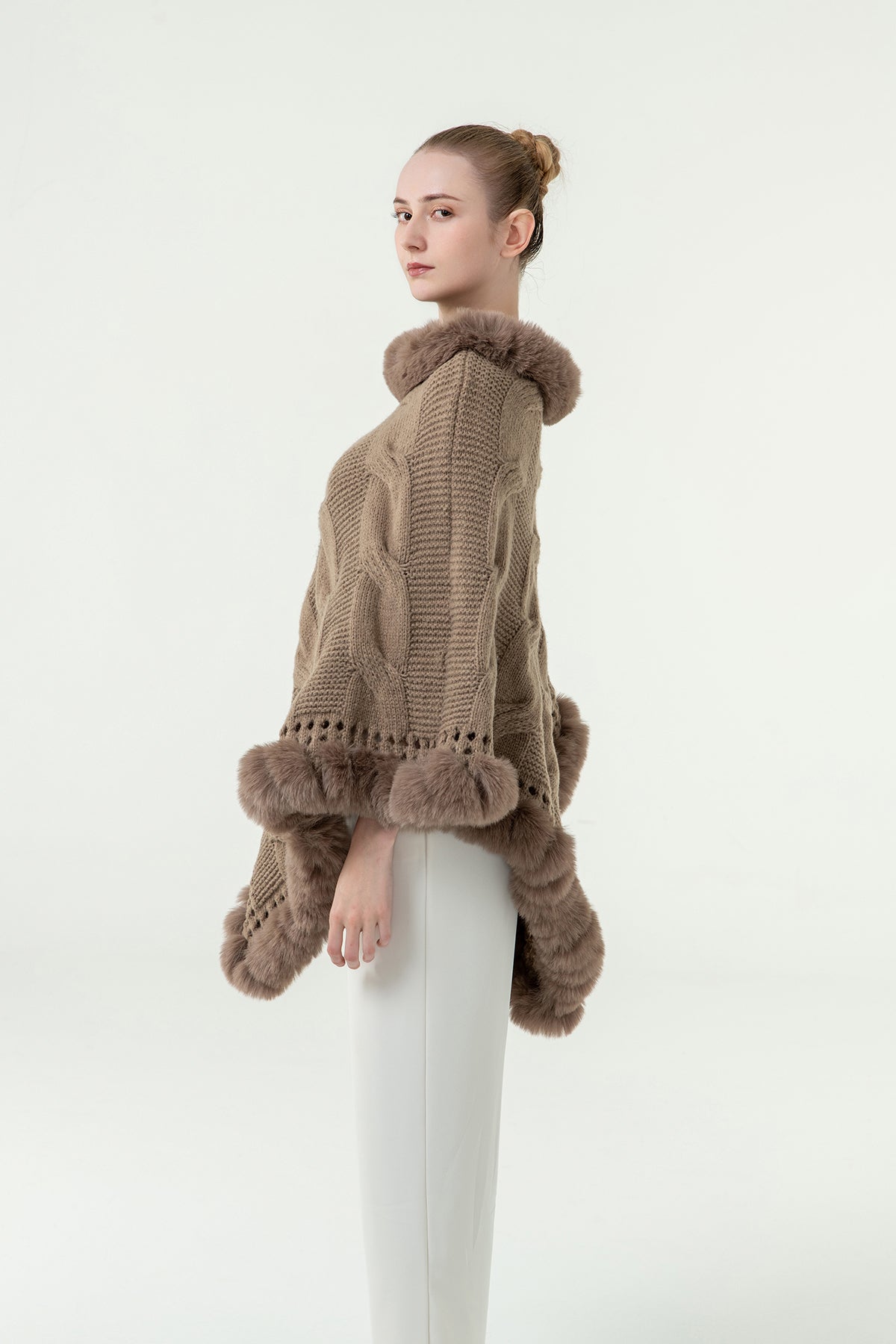 Discover the epitome of luxury with our cashmere and wool women's knitted fur poncho collection. Each piece is designed to provide unparalleled warmth and elegance. Embrace high fashion with our designer knitted ponchos, perfect for adding a touch of sophistication to any outfit.