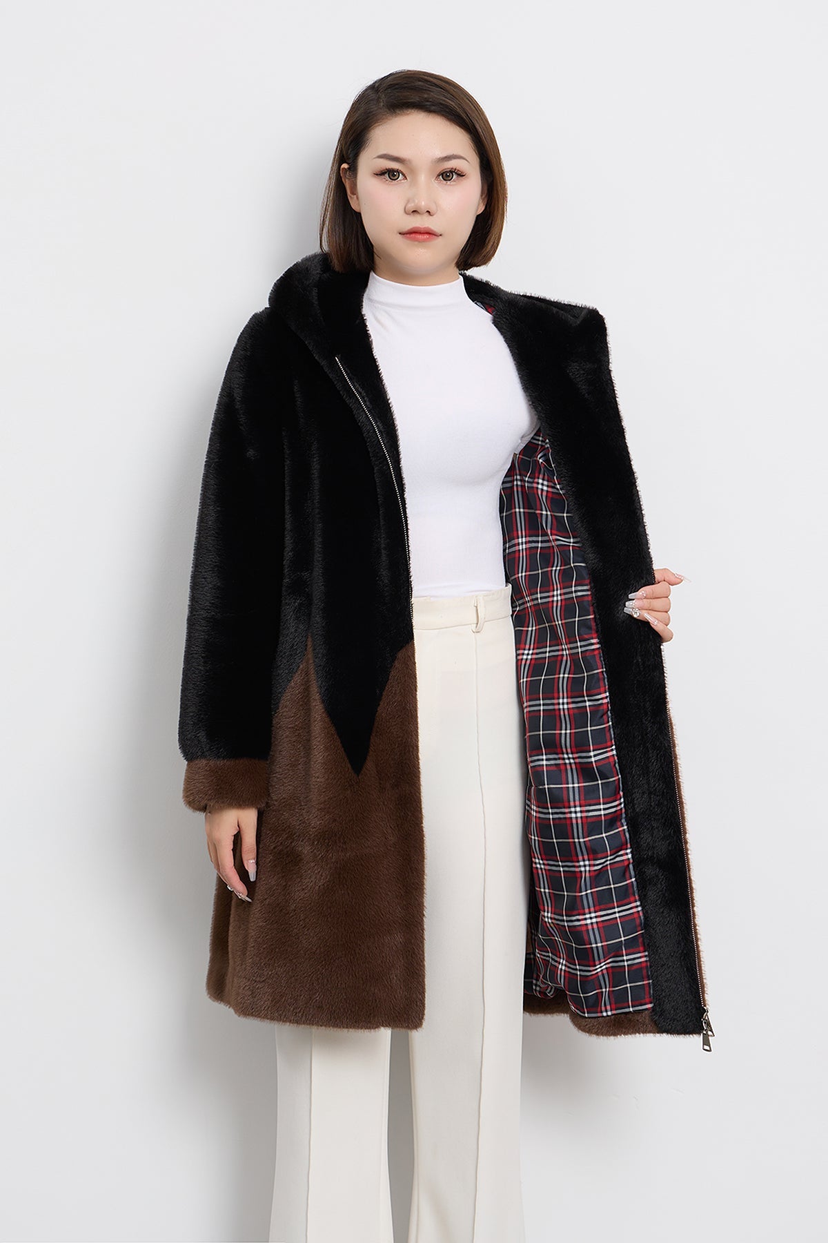 Women's Hooded Fur Short Coat Exclusive Design - Black/Brown
